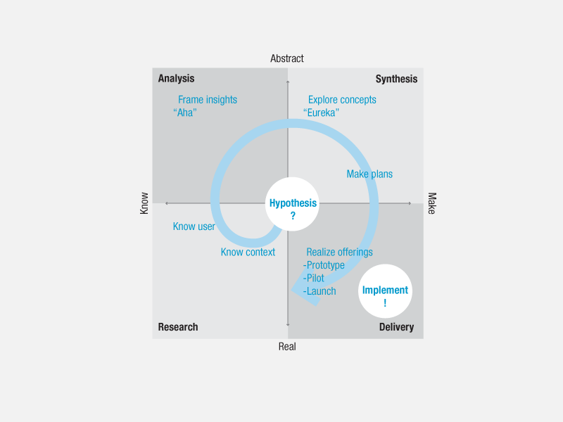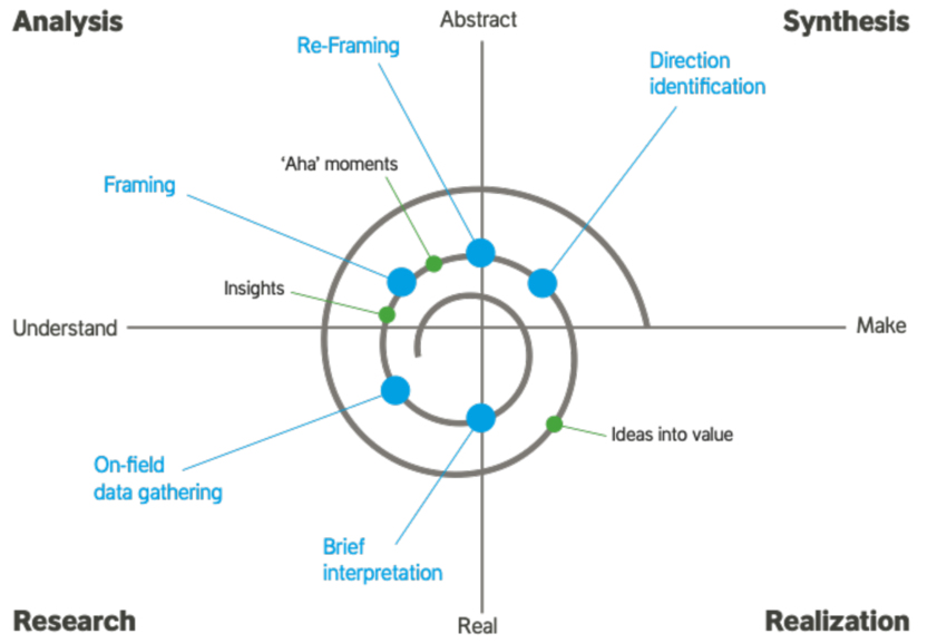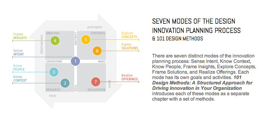 It’s worth mentioning that this repictured version in the video above is essentially the same model used (created?) by Vijay Kumar, as the organizing framework used in his book 101 Design Methods
